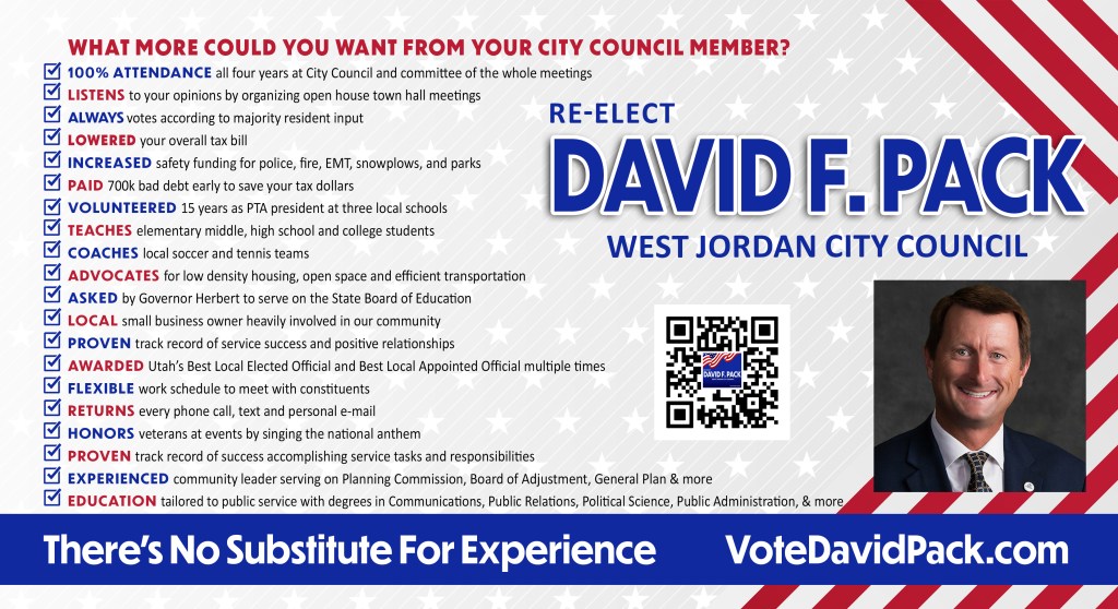 There is no substitute for experience. David has lived and raised his three children in West Jordan for the past 25 years. West Jordan needs someone who can hit the ground running, who has already established decades-long working relationships of trust with city staff and residents. David has served as PTA/PTSA President and Community Council Member 15 consecutive years.